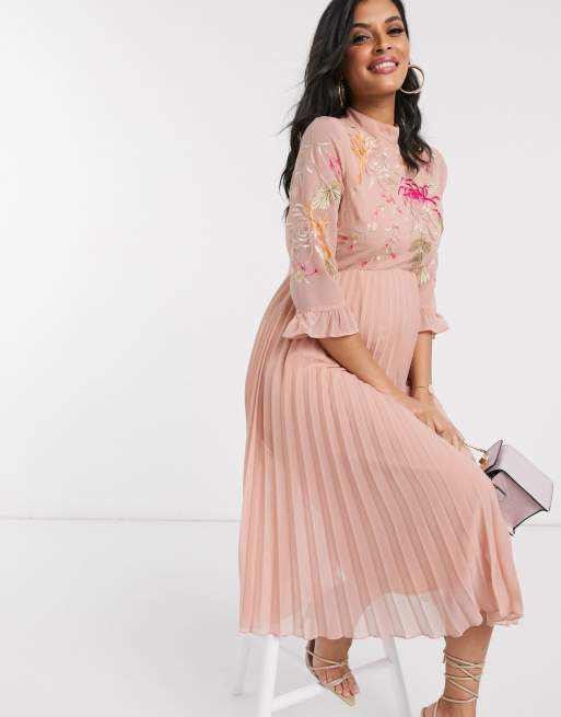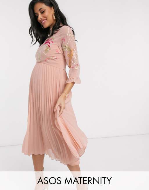 Asos Design Maternity Embroidered Pleated Midi Dress With Fluted Sleeve In Dusky Pink Asos